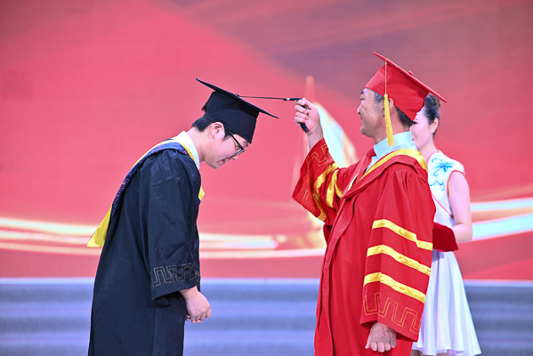 随后,顿祖义为毕业生代表拨正流苏,颁授学位,并合影留念。