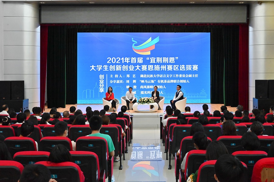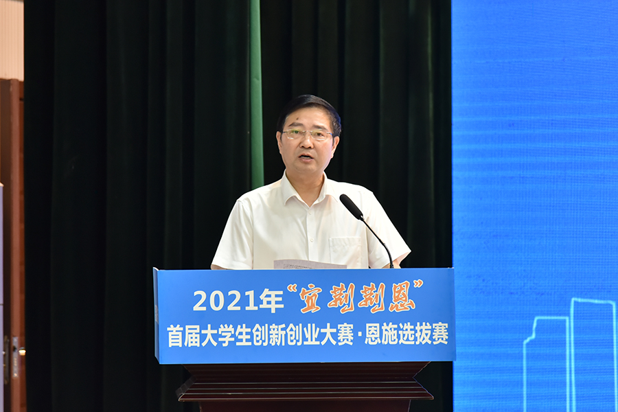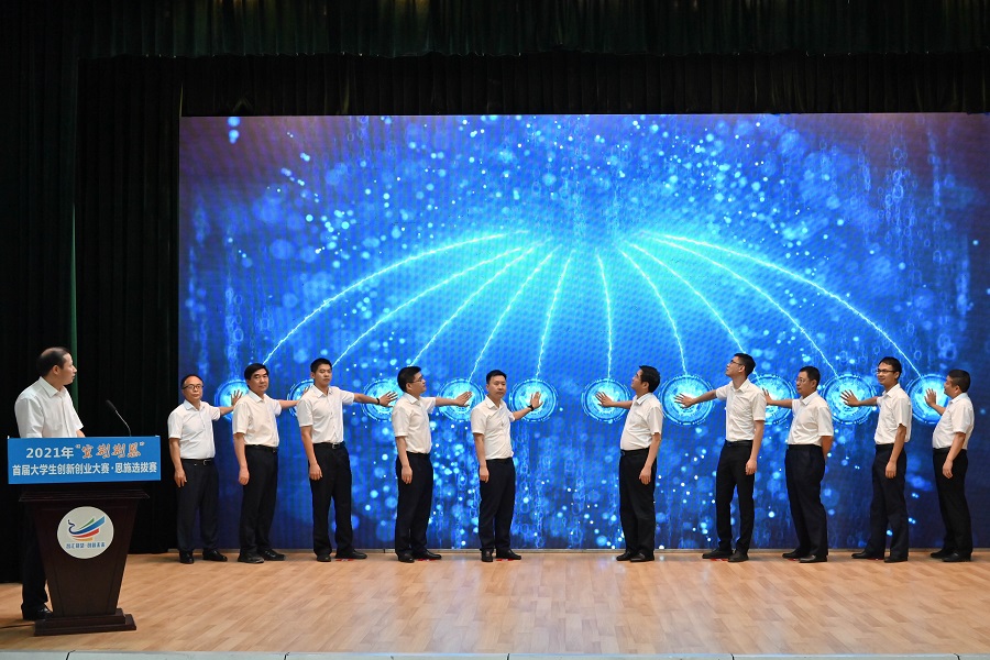 领导及嘉宾集体登台共同开启大赛报名通道,2021年首届“宜荆荆恩”大学生创新创业大赛恩施州赛区选拔赛正式启动。