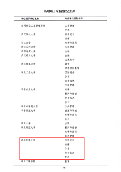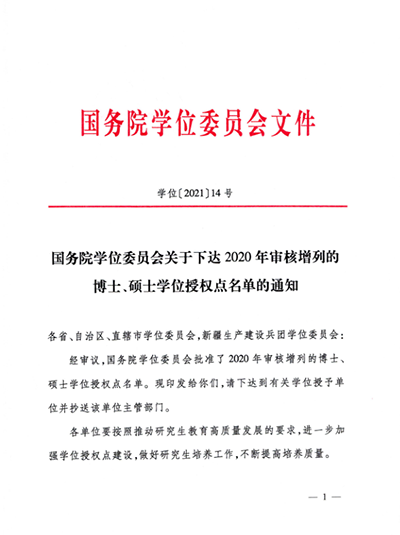 本网讯(通讯员 李伟)近日,国务院学位委员会发出《关于下达2020年审核增列的博士、硕士学位授权点名单的通知》文件(学位[2021]14号),我校2020年申报的应用统计、法律、体育、电子信息、艺术等5个硕士专业学位授权点全部获批。至此,我校硕士学位授权点总数达19个。