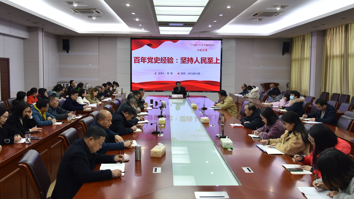 本网讯(记者 廖希为)11月30日,学校党委副书记邓磊在行政楼三号会议室为分管和联系单位的党员干部宣讲党的十九届六中全会精神,拉开了我校开展十九届六中全会精神理论宣讲的序幕。