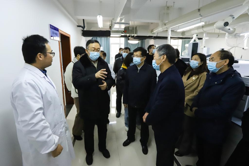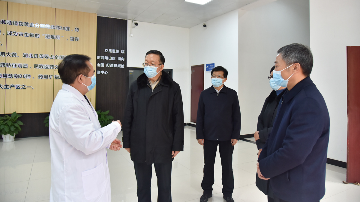 田学军一行还考察了学校武陵山中药材检验检测中心,参观了中心检验检测实验室的核心区域,并详细了解了中药材检验检测促进地方产业发展以及中药材科研成果转化等方面的情况。中心负责人汇报了中心的建设背景、功能布局、核心设备等情况。田学军对我校立足武陵山区资源优势,走产业发展特色之路的思路和做法给予了高度评价。