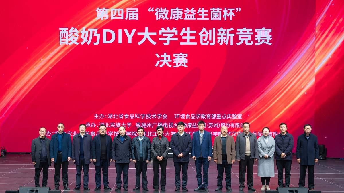 12月11日,由湖北省食品科学技术学会、环境食品学教育部重点实验室主办,我校及恩施州广播电视台、微康益生菌(苏州)股份有限公司联合承办的第四届“微康益生菌杯”酸奶DIY大学生创新竞赛总决赛在恩施电视台1000平米演播厅举行。来自我校及华中农业大学、武汉轻工大学、武汉设计工程学院、湖北大学知行学院、中南民族大学等13所高校的22支团队同台比拼。最终,武汉设计工程学院的参赛作品“浮云花海”荣获一等奖,我校的参赛作品“酸奶马良趣涂鸦”荣获三等奖。