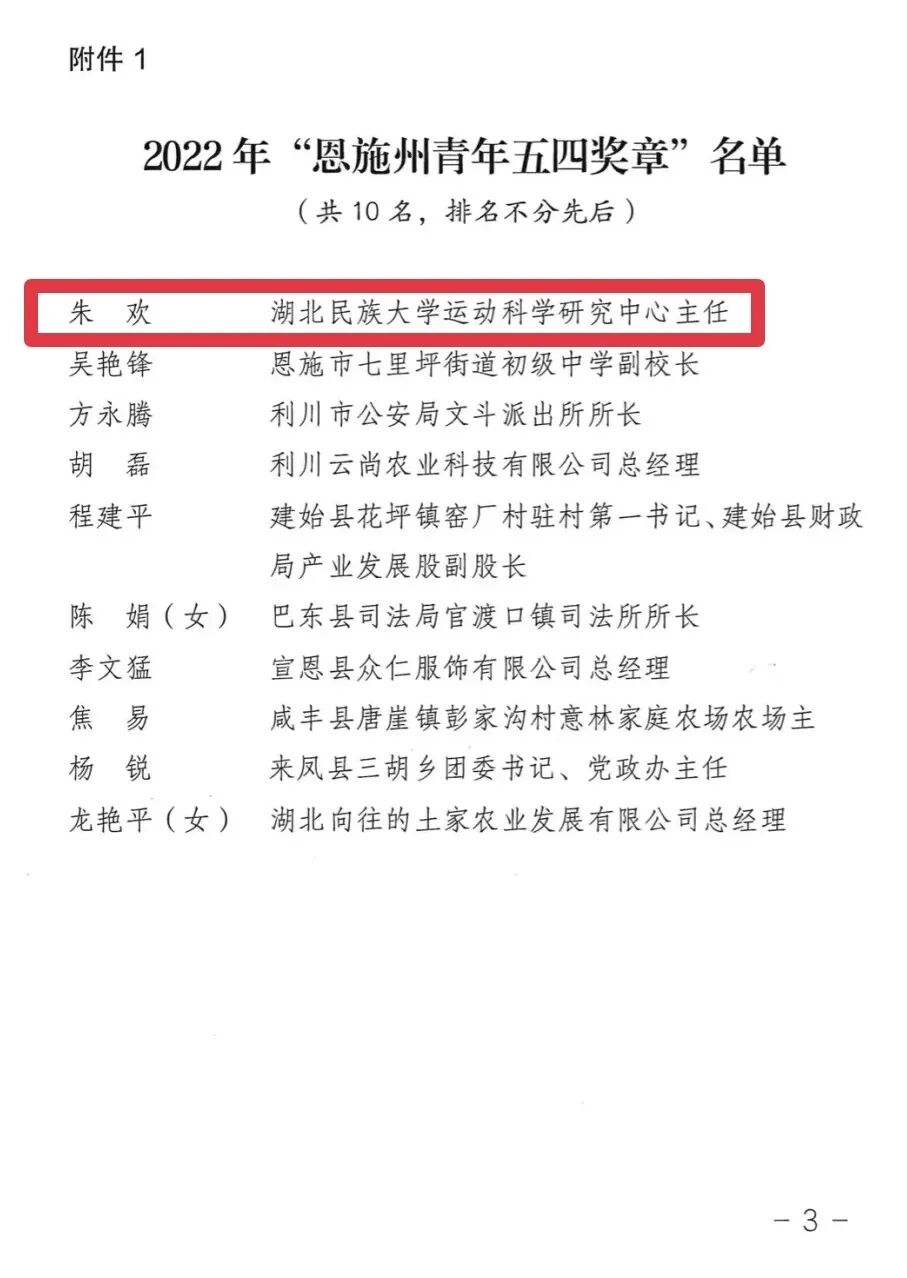 5月7日, 共青团恩施州委、恩施州青年联合会发布2022年“恩施州青年五四奖章”名单,我校体育学院青年教师朱欢名列榜首。