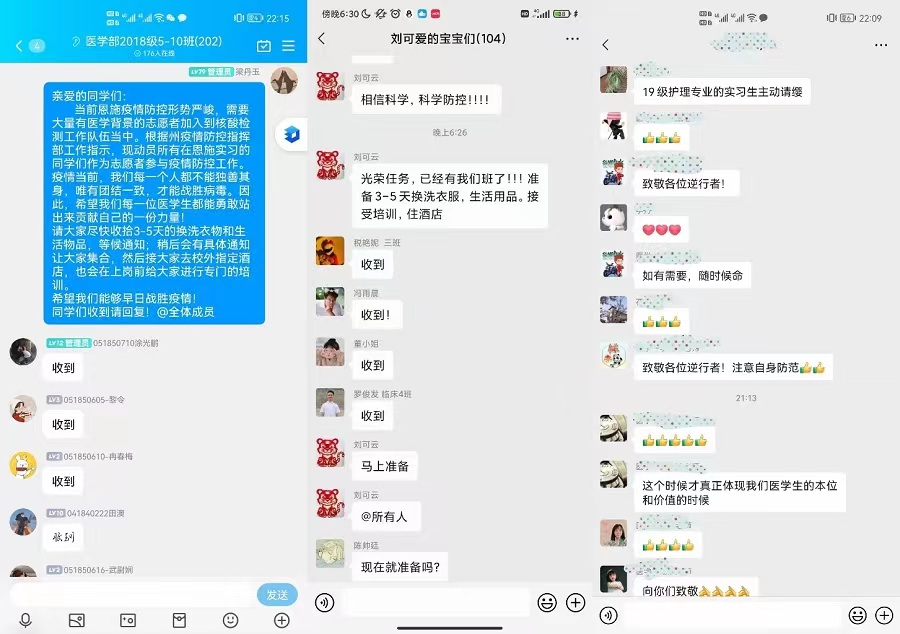 18:00——根据学校党委的部署,医学部向同学们发出号召:“当前恩施疫情防控形势严峻,需要大量有医学背景的志愿者加入到核酸检测队伍当中。希望我们每一位医学生都能够勇敢站出来,贡献自己的一份力量!”疫情就是命令,防控就是责任!同学们闻令而动,争先恐后,踊跃报名。