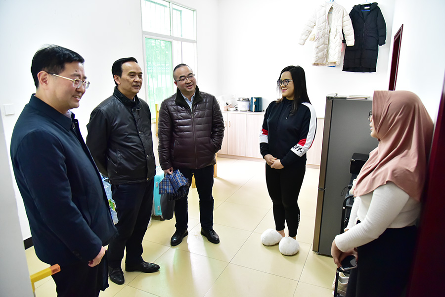 6日下午,向前进一行参观了博学片区外国语学院“寓”见“悦”享“一站式”学生社区活动空间,走访了部分学生寝室。“你的家乡是哪里?在学校习不习惯?”“你对学校有哪些建议?”在博学七栋,向前进亲切询问预科同学的个人情况,详细了解大家的学习、生活情况,叮嘱他们多与辅导员和老师沟通交流,勉励他们以积极的心态和良好的面貌适应学校生活。