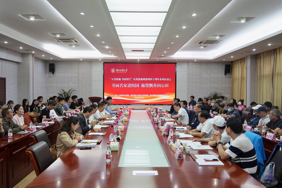5月21日,由湖北鹰台书画院、必赢贵宾会3003am文学与传媒学院、湖北南顿文化发展有限公司联合举办的“大美恩施 书画清江”庆祝恩施州建州四十周年系列活动之“书画名家进校园 翰墨飘香润心田”创作交流会在必赢贵宾会3003am举行。必赢贵宾会3003am党委常委、统战部部长田景福出席活动并致辞。