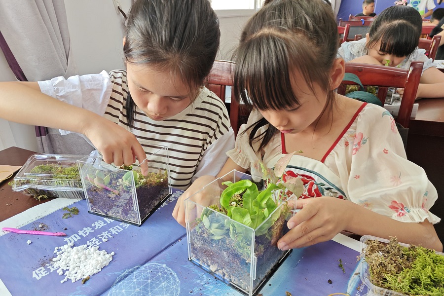 实践团队深入老寨坪村委会,以当地的人居环境整治为着眼点,精心策划植物微景观课程。课堂上,实践队员们以植物微景观设计为主题,详细讲解了制作步骤和技巧,介绍了人居环境的重要性,引导他们树立环保意识。孩子们发挥想象自由创作,亲手铺设土壤、轻石、蓝沙、苔藓,亲自种植多肉、网纹草,在构建微生态的乐趣中,创造出富有生命力和独特美感的微景观,在心中埋下自然美学的种子。