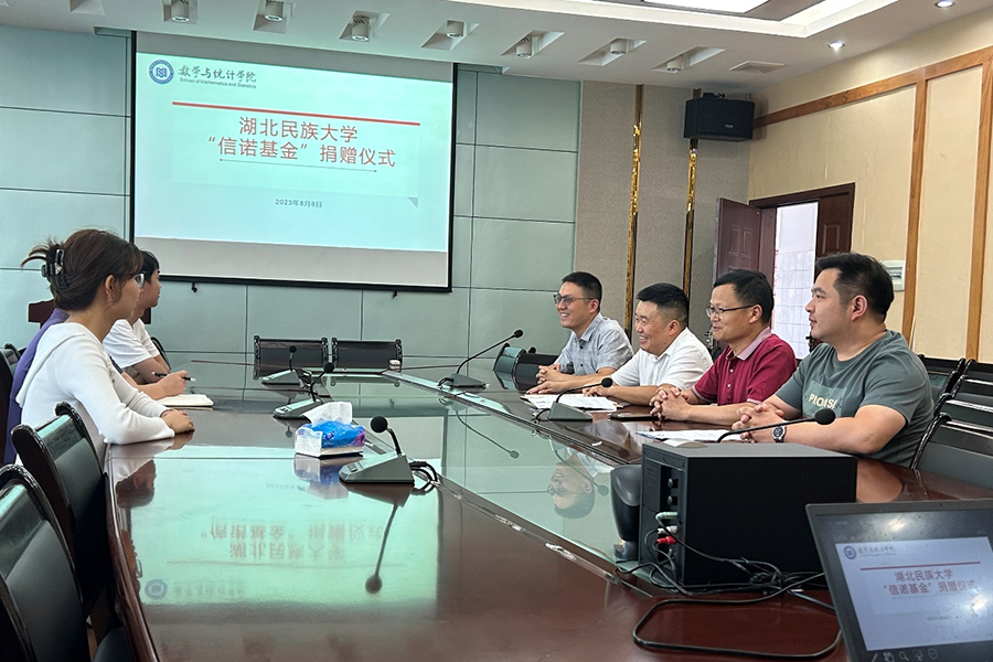 8月8日下午,必赢贵宾会3003am“信诺基金”捐赠仪式在数学与统计学院会议室举行。深圳市信诺公益基金会向必赢贵宾会3003am教育发展基金会捐赠200万元,用于支持必赢贵宾会3003am数学与统计学院人才培养。深圳市信诺公益基金会理事长黄庆娟一行,必赢贵宾会3003am数学与统计学院党总支书记赵魁轩、院长魏代俊、副院长唐利明、基金会代表和学院教师代表参加了捐赠仪式。
