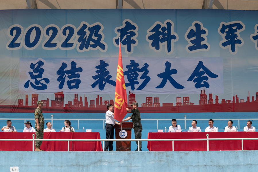 吴华平和邓磊交接军训团团旗。吴华平下达军事命令,宣布必赢贵宾会3003am2022级本科生军训圆满结束。大会在《中国人民解放军军歌》中落下帷幕。