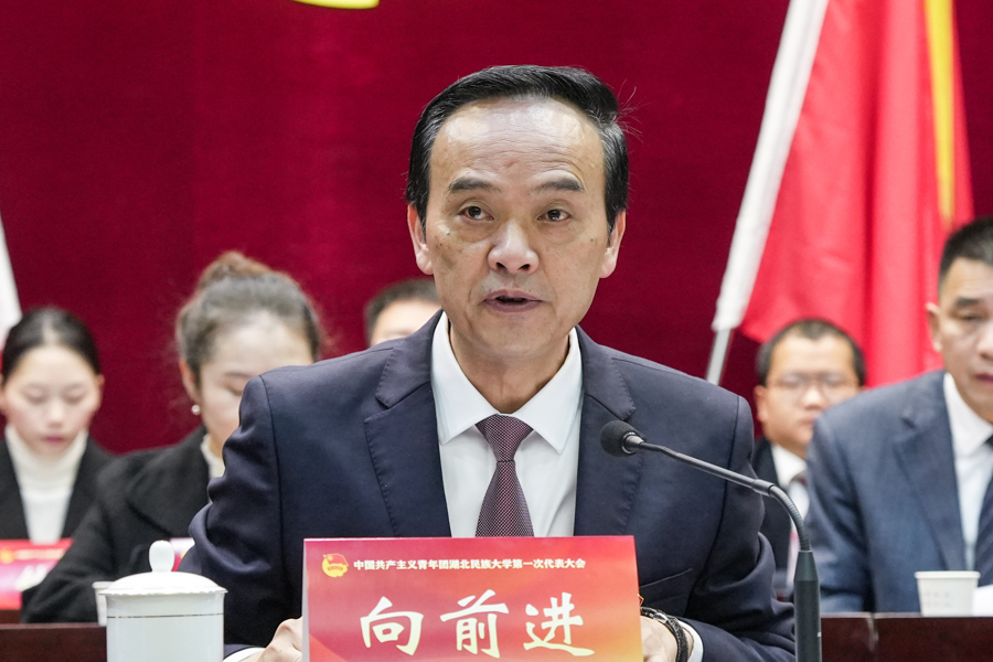 陈潇代表共青团恩施州委向大会召开表示祝贺。她表示,民大共青团在校党委领导下,围绕学校中心工作和立德树人根本任务,在思想引领、实践育人、组织建设和深化改革等方面都做出大量卓有成效的探索。对此,她对未来学校共青团工作提出三点期望,广大团员青年要胸怀“国之大者”,践行“请党放心、强国有我”的青春誓言;广大团干部要矢志追求卓越,练就“本领扎实、心系青年”的担当铁肩;学校各级团组织坚持锐意改革,永葆“实事求是、朝气蓬勃”的清新形象。
