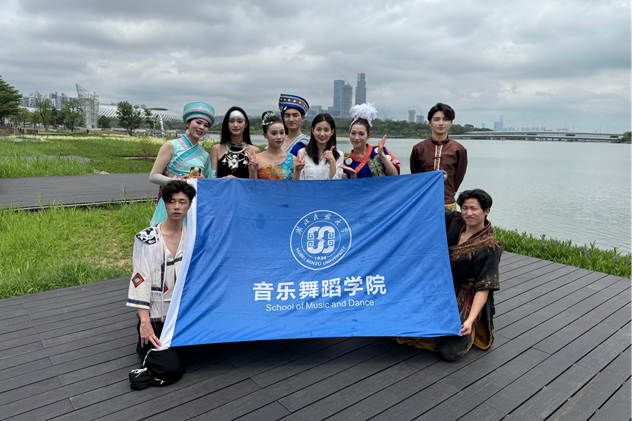 4月17日至25日,舞蹈专业8名青年学子跨越1500公里奔赴深圳,在人才公园现代天际线与澄澈水波构成的“天空之境”间,与中南民族大学、西北民族大学、西藏民族大学等高校的师生团队联袂献演《山水画卷》。民大学子通过创新编排将民族服饰化作流动的生态诗篇,让土家织锦在现代都市光影中流转,使传统文化符号在现代语境中实现创造性转化。