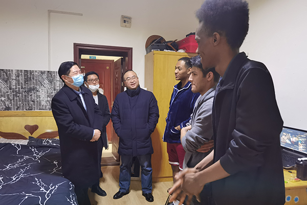 邓磊一行先后来到博爱公寓六栋、教工宿舍一栋和外籍教师宿舍,与来自美国、巴基斯坦、坦桑尼亚、赞比亚、加纳、卢旺达、博茨瓦纳等国的外籍教师和留学生交谈,了解大家在校的工作、学习和生活情况。来自美国的外籍教师Alexander和Phelan向邓磊一行详细汇报了过去一年在学校的工作情况。同学们用中文一一做了自我介绍,汇报了各自的学习和所在国家的情况。大家对学校的慰问、关怀和祝福表示感谢。