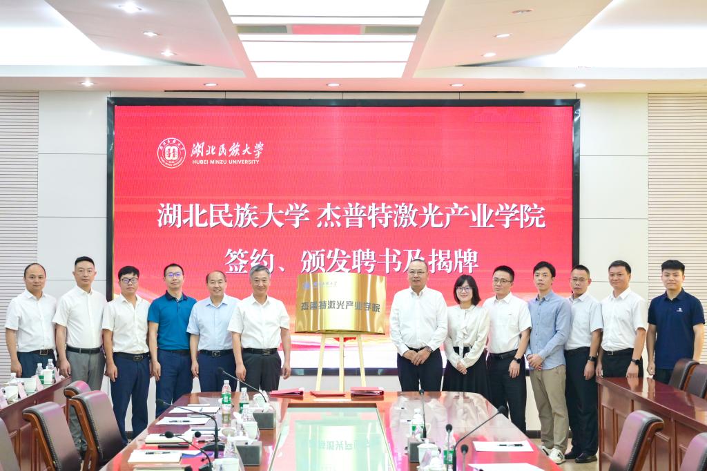 顿祖义代表学校对杰普特激光产业学院的成立表示祝贺,对黄治家董事长情系母校、支持母校的重大善举及杰普特公司反哺社会、关照教育的重大行动表示衷心感谢。他指出,激光产业学院的成立是学校加快推进教育链、人才链、产业链、创新链深度融合的重大措施,表明了学校深化综合改革、促进产教融合、加快转型发展的坚定信心。