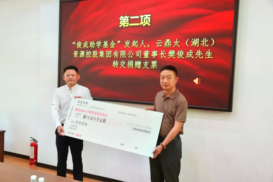 樊俊成分享了公司在恩施的发展情况,云鼎太(湖北)资源控股集团有限公司以人力、商贸、医疗、科技等四大板块为支撑,企业未来战略重心在恩施及西部方向。他表示,此次捐赠是一份社会责任,也是企业发展进程中应有的担当,未来愿在就业等方面与湖北民大加强沟通合作,搭建更加开阔的发展平台。