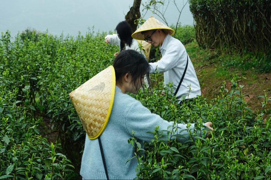 在茶垄田园间,学员们仔细聆听茶园负责人的讲解,学习正确的采茶技巧,小心翼翼地穿梭在茶树间,体验着采茶的艰辛与乐趣。