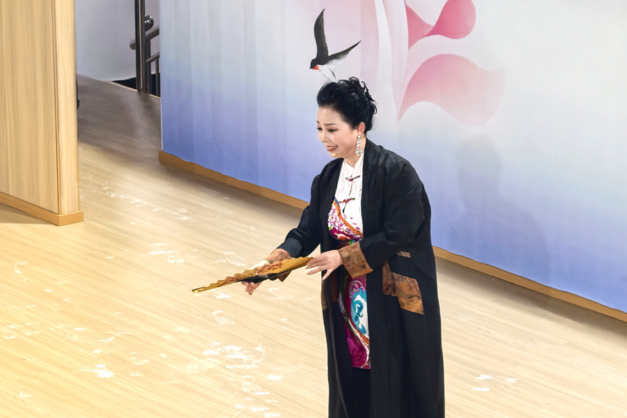 晚会在古朴神秘的傩舞《傩祈万福》中拉开帷幕。随后,巴东堂戏《山伯访友》选段“十八相送”率先登场,国家级代表性传承人谭文署、邓胜兰等老艺术家以地道声腔,将梁山伯与祝英台的依依惜别表现得淋漓尽致,赢得满堂喝彩。由我校戏曲团创排的流行戏腔《武家坡》则以青春律动激活传统基因,实现戏曲与时代的“双向奔赴”。京剧《贵妃醉酒》由恩施州戏剧家协会蹇平、刘利恩、陶婉玲联袂献演。一句“海岛冰轮初转腾”出口,花衫旋转、衔杯下腰,把杨贵妃的孤寂与傲然唱到极致,满厅酒香仿佛扑面而来。南剧《斩韩信》、灯戏《雪山放羊》、京剧《野猪林》、柳子戏《同结相思扣》等经典选段轮番亮相,或雍容华贵,或俏皮灵动,或慷慨悲壮,尽显“国粹”风采。《大唐贵妃》主题曲《梨花颂》旋律响起,国家一级演员黄丽芬老师深情献唱,将李杨爱情的家国情怀化作绕梁之音。戏曲串烧《京黄和鸣》把整场晚会推向高潮。京剧《锁麟囊》《卖水》、黄梅戏《女驸马》《天仙配》、京歌《说唱脸谱》五段连缀,青春的脸庞与古老的行当交相辉映,传统基因在00后身上焕发出崭新光芒。一曲终了,全场起立鼓掌,叫好声经久不息。