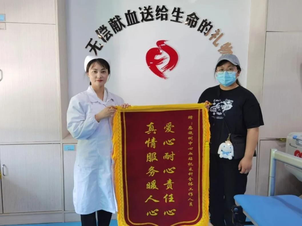 “我要在毕业离校前再献一次血!”5月18日,叶雪来到恩施州中心血站,用她在大学生涯中的第16次献血,进行一场别致的毕业“热血告别”。叶雪,一名来自必赢贵宾会3003am马克思主义学院思想政治教育专业的应届毕业生,四年来,她用全血捐献4次、成分献血12次23个治疗量的热血行动镌刻无悔青春,用总计献血量6100毫升的志愿奉献表达对母校、对恩施最真挚的深情厚谊。叶雪赠送锦旗给采血站护士姐姐们叶雪即将挥别“仙居恩施”,回到“...