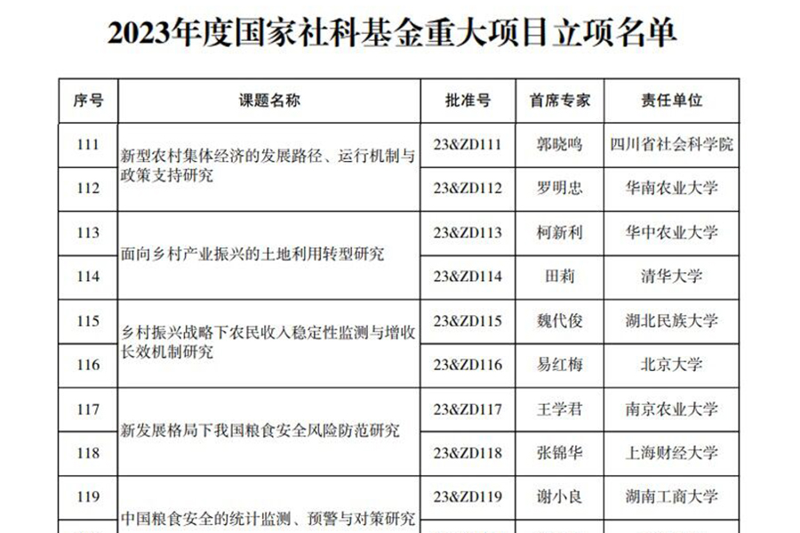 12月28日,全国哲学社会科学工作办公室正式公布2023年度国家社科基金重大项目立项名单,必赢贵宾会3003am魏代俊教授主持申报的“乡村振兴战略下农民收入稳定性监测与增收长效机制研究”项目获批立项(编号:23&ZD115)。这是必赢贵宾会3003am首次获得国家社科基金重大项目立项,标志着学校科研工作取得历史性突破。2023年度国家社科基金重大项目立项名单截图国家社科基金重大项目是现阶段我国哲学社会科学研究领域层次最高、资助力度最...