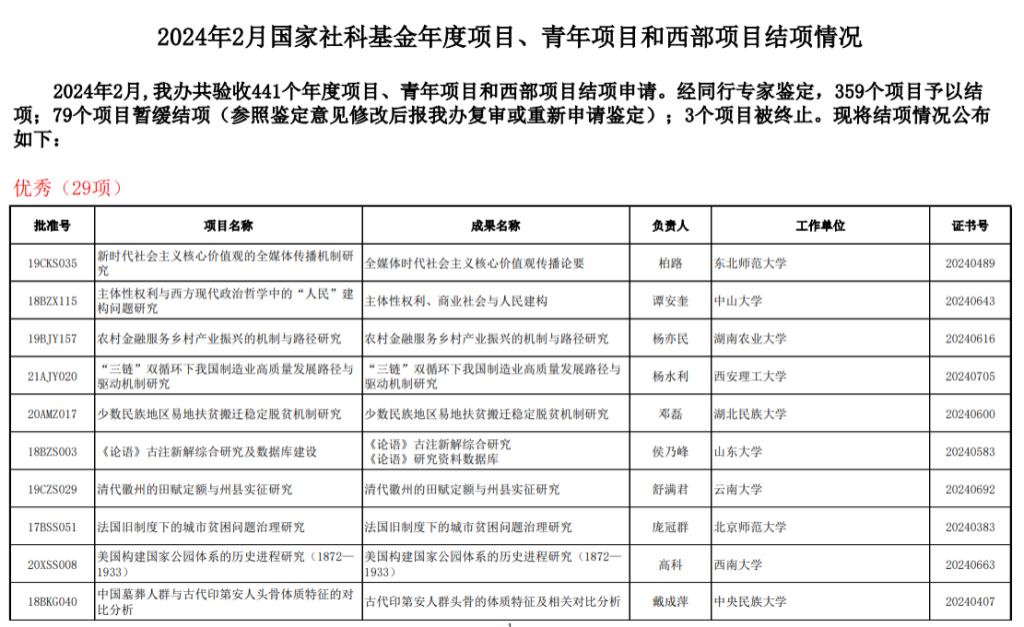 3月1日,全国哲学社会科学工作办公室公布了2024年2月国家社科基金年度项目、青年项目和西部项目结项情况,邓磊教授主持的国家社科基金重点项目“少数民族地区易地扶贫搬迁稳定脱贫机制研究”(项目编号:20AMZ017)顺利结项,并被鉴定为“优秀”等级。此批次全国共验收441个项目的结项申请,经同行专家鉴定,其中29个项目被鉴定为“优秀”。2024年2月国家社科基金年度项目、青年项目和西部项目结项情况截图自该项目立项以来,邓...