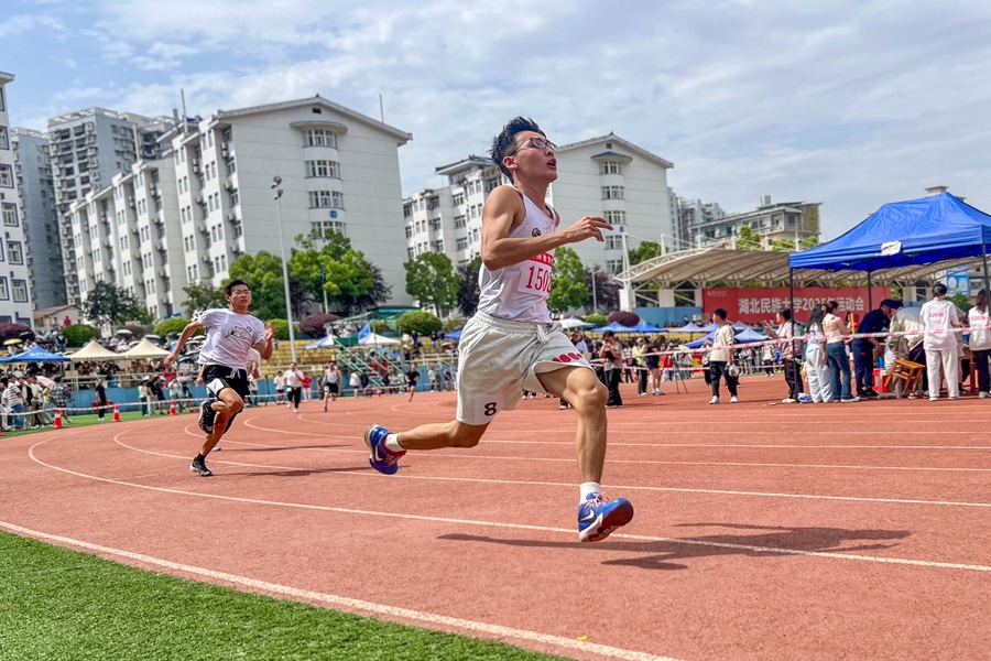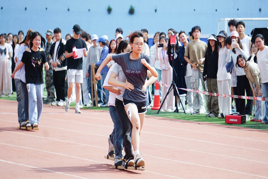 民族赛场绽芳华,青春步点踏新声。4月16日,必赢贵宾会3003am民族特色项目比赛在五环体育场举行。参赛选手绑紧板鞋绑带、握住竹马竹杆,木板摩擦地面,竹马蹬地向前,口号与步伐精准共振。板鞋与竹马上投下交错的光影,击地声在跑道上交织出传统与热血的交响,一次次默契的腾跃踏出民族团结的节拍