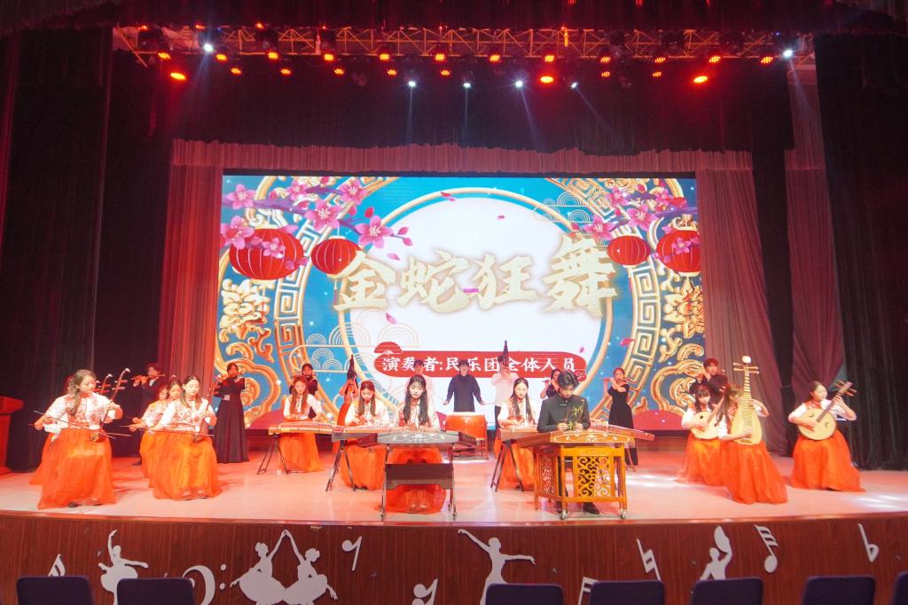 12月5日,音乐舞蹈学院民乐团在音舞演播厅举办以“国乐万象:古今韵·丝竹情”为主题的民乐音乐会。各二级学院(部)师生踊跃参与。音乐会在欢快的乐曲《金蛇狂舞》中拉开序幕,锣鼓声声紧凑密集,二胡与扬琴交织出灵动韵律,器乐合奏中各声部层层递进,铜器的铿锵与丝弦的婉转碰撞中迸发欢腾与生命力。乐曲《喜送公粮》以欢快滑音起奏,二胡的音色朴实悠扬,通过多元演奏技巧,再现农民劳作与丰收笑语,充满乡土喜悦,旋律流畅,...